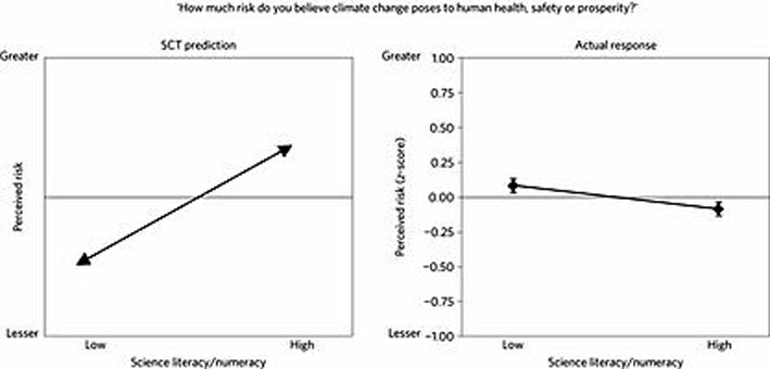 As scientific/tech knowledge and numeracy appears to be more common among "hierarchical individualists" than among "egalitarian communitarians", this meant that in the sample as a whole the effect of more scientific knowledge and numeracy was to increase scepticism."