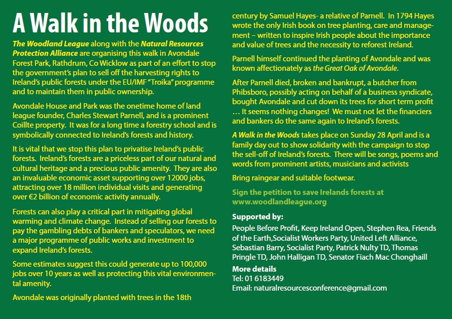 The Woodland League are intending to organise a walk in Avondale, co Wicklow, the home of Charles Parnell and also a prominent Coillte forest property, it was also a forestry school for a long time and is very symbolically connected to Ireland's forest history.