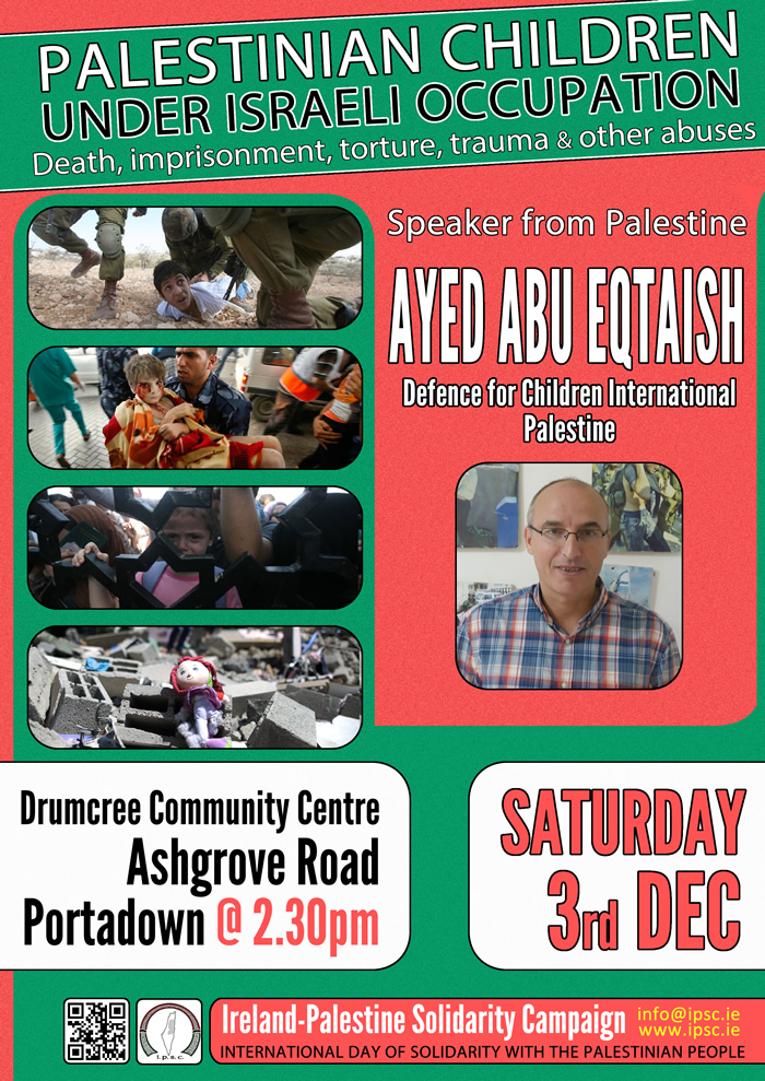 To commemorate the annual International Day of Solidarity With the Palestinian People 2016, the Ireland-Palestine Solidarity Campaign (IPSC) is honoured to host Ayed Abu Eqtaish from Defence For Children International in Palestine. Mr. Abu Eqtaish will speak on Saturday 3rd December in Drumcree Community Centre, Ashgrove Road, Portadown at 2.30pm.