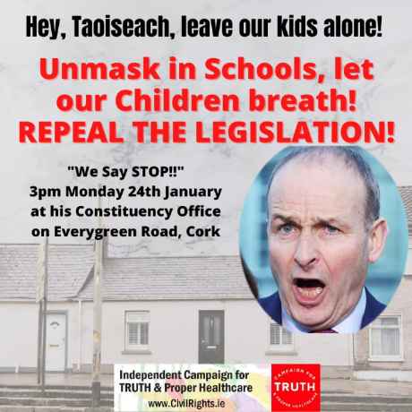 “We are here for the purpose of demanding an immediate end to the emergency powers that have been enacted, and the immediate removal of the mandate on children, in our schools in particular, that they have to wear face coverings and sit in cold classrooms all day long on the basis that this is somehow promoting good healthcare” – Dairmuid O Cadhla