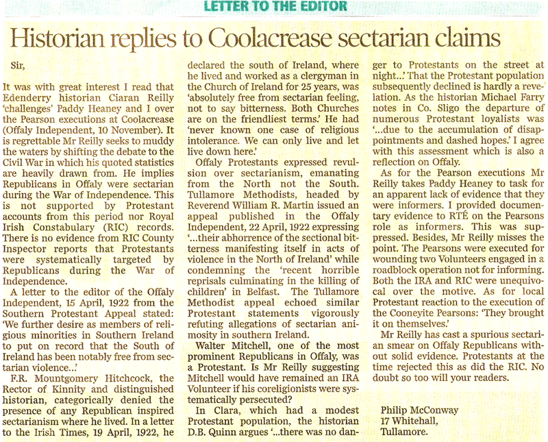 The course of the War of Independence and Civil War in Offaly has also been investigated in depth by Tullamore historian Philip McConway. McConway’s definitive book on the subject includes his findings on the Pearson case, and is due to be published this year. His January 2007 lecture on the subject is summarised at the Offaly History website: