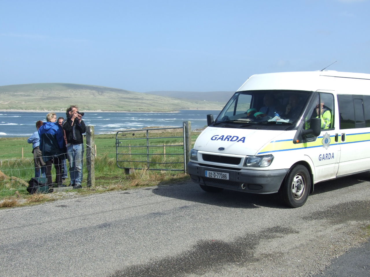 The new camp which was set up on Saturday 16th, with the permission of a local landowner, near the Shell compound at Glengad beach, drew swift attention from Shell security and Gardaí who joined forces on Friday 22nd and formed a line unlawfully, but only temporarily, to close off the public beach there. Because of confusion over the sole ownership of the land where the camp was based, Garda Supt. John Gilligan decided to enforce a complaint of trespass against the camp from another member of the family who lives abroad but who appears to have a substantial claim on the land. Supt. Gilligan arrived to the camp on the Friday evening to give the camp 48 hours to leave or else face threat of removal by Gardaí under Section 19 of the Criminal Justice (Public Order) Act 1994, as amended by Section 24 of the Housing (Miscellaneous Provisions) Act 2002.