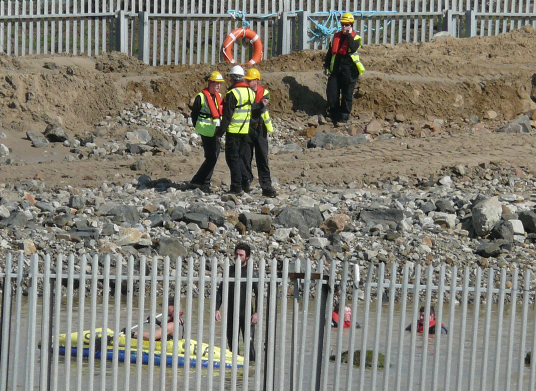heres vid from action a few weeks back, when 8 people were arrested. Revolt video were there and Paul made this vid which captured when the construction works came close to causing serious injury, even close to death, for 2 brave activists. Apart from close to hitting the activist, with such a load of rock, water and sand being dumped, a tonne?, the swell that followed might have sucked the activist into its swirling murky water, and if pulled in, the activist would surely have been pulled into the fluid sub surface cloud of sand and water.