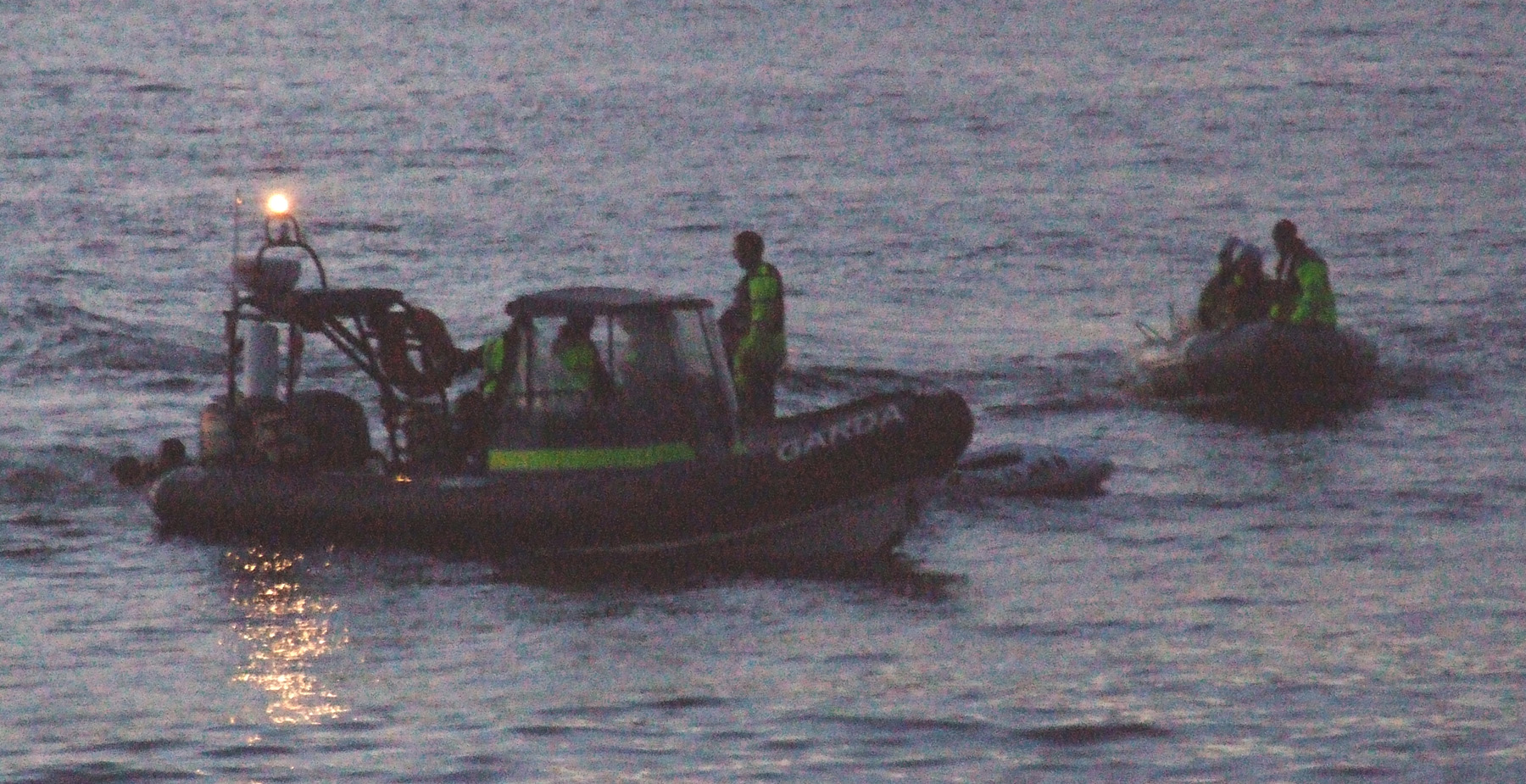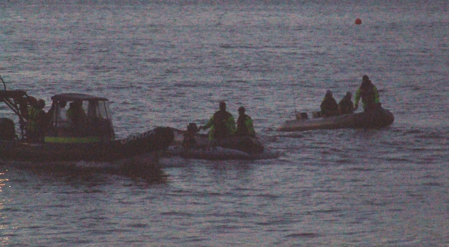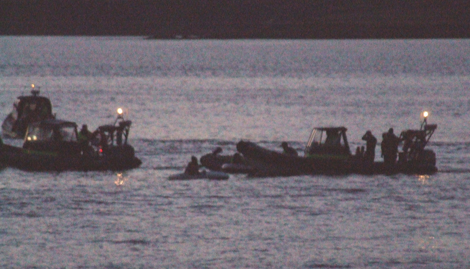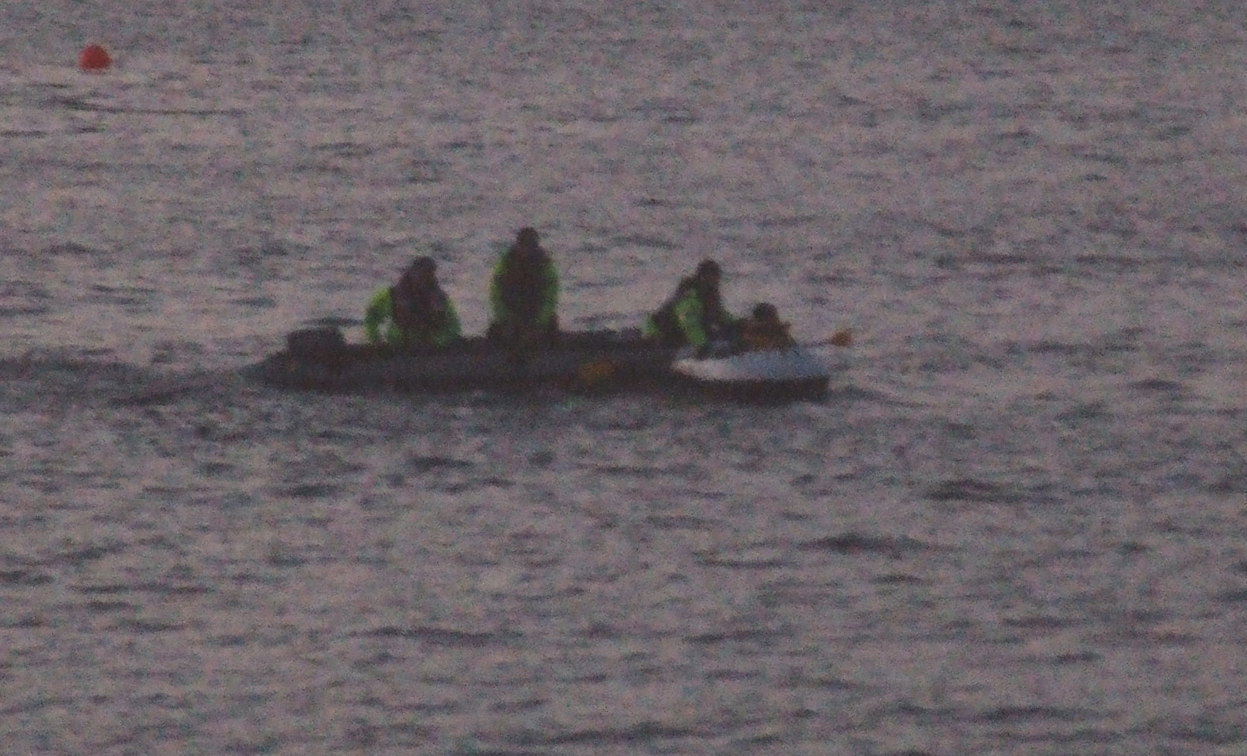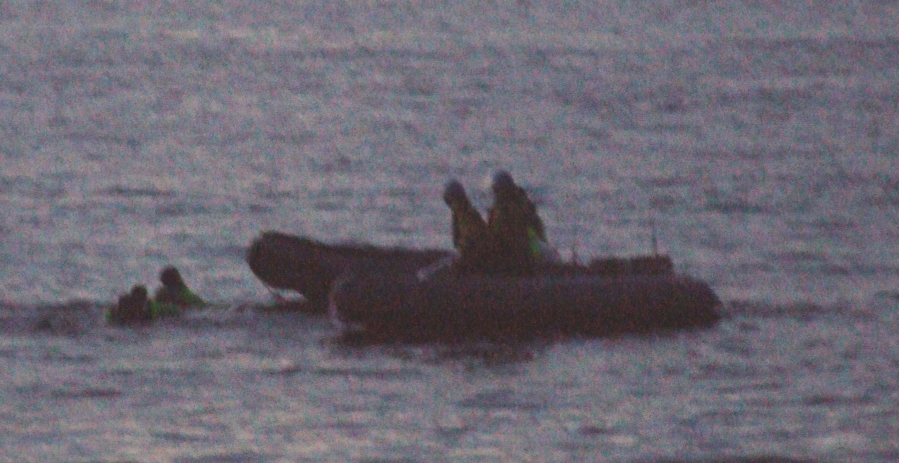 ..from this evening's action. Image quality compromised by low light levels. Photo and caption credits as before. Gardaí, Navy and Shell security operated all through without regard to safety - even their own it seems. That person in the water could've been mangled by the outboard motor on that Garda rib!