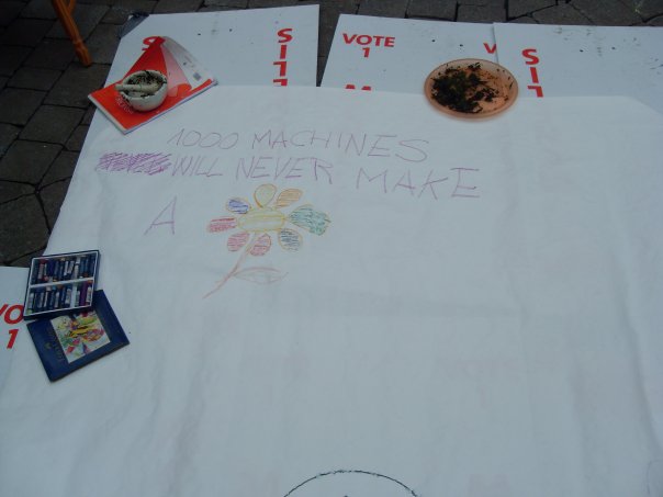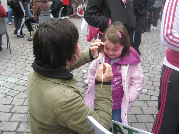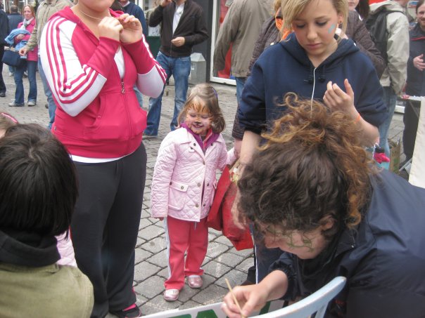"Free Food, Free Stuff, Free Fun, Free Social Interaction, Free World for Everyone", was the chant of the day, encouraging everyone to join in the fun. 'Feck Money' could also be heard every now and again, amongst the joyful shouting and whooping! The event started at 1.30pm, when a 'Really Really Free Market', magically appeared out of nowhere; clothes, videos, toys, teddies, cards, matches, markers, crayons, zines and more were all decked out on a table and offered to bemused passers-by - for free. Confused by the idea of free stuff, those who were afraid to ask were left wondering 'what's the catch?' Needless to say, there was none. Just a group of people who believe in a better world where gifts can be given freely, and the only profit sought is the joy of making others happy. They were promptly joined by Galway Food-Not-Bombs, (who share vegetarian food and messages of peace and a better society, with the public), to feed the participants and onlookers with lovely vegetarian soup, bread and amazing cookies at the REAL recession busting price of no euros and no cents!