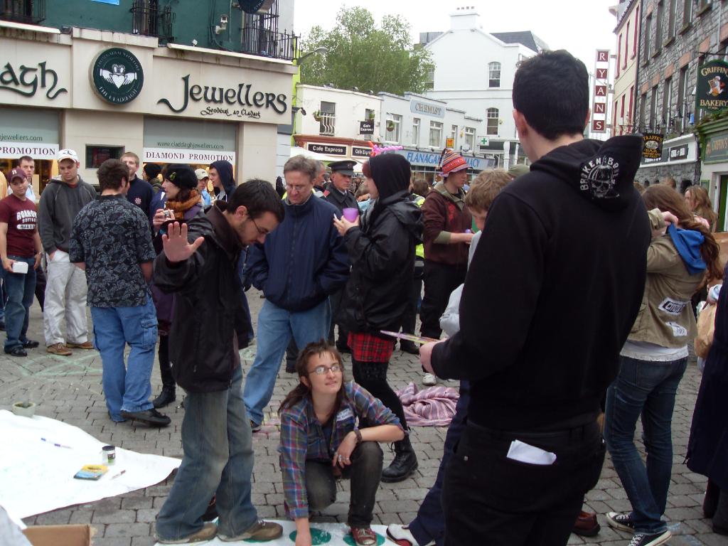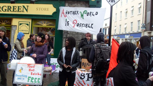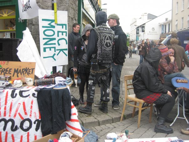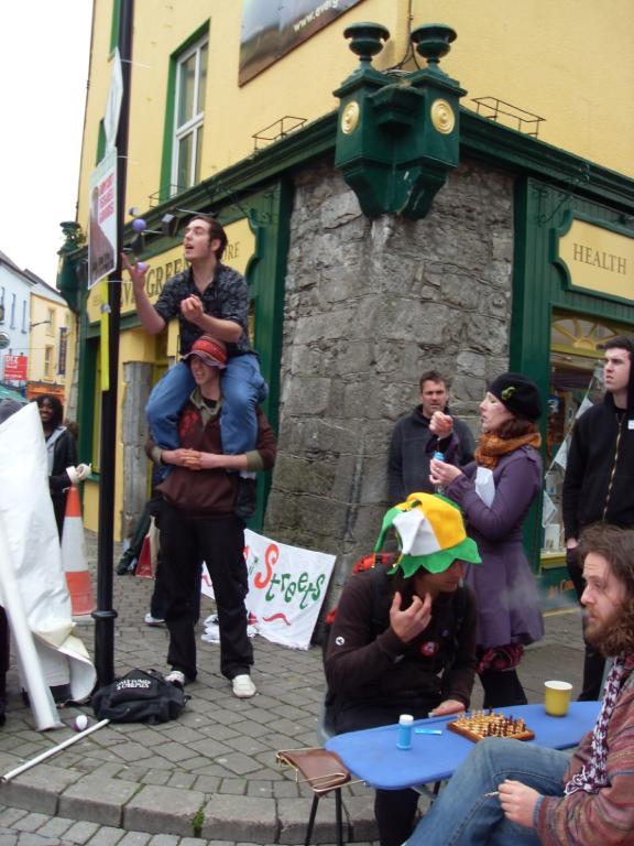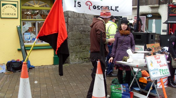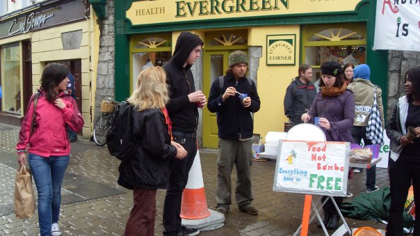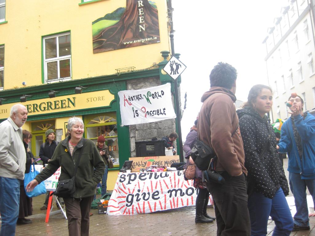 On Saturday Afternoon, Galwegians and their friends from around the country and world, came together on newly renamed (by us), Anti-Shop Street, to take back our space from the capitalist, consumerist culture which has taken it over, with its bizarre ideas of a life dedicated to shopping, spending, buying and profit, so that we could share an experience of another world, where everything is free, people share and give food, fun, stuff and life, simply because they can and it just feels good!