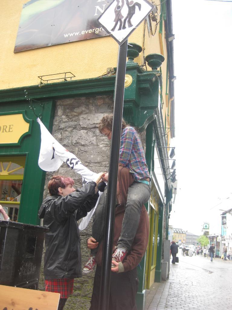 Galway has effectively been sold to Volvo for the next two weeks. Hoteliers triple room prices. Never mind that Galway's glorious City Council has refused funding to the Claddagh Boatmens' Association,a group charged to repair and build the traditional Galway 'hookers' and gleoiteogs but can call in the Red Arrows to let the RAF show the strength and skill of its pilots over Galway Bay. Worse, Galway City Council - where top officials are even looking for new jobs elsewhere - has designated the loudest, brashist and most commercially-grasping area of the city as a 'Latin Quarter,' even though some local businesses think it laughable, as do most real Galwegians. They've taken a plot once renowned as a 'red light' district and turned it into some sort of faux-mediaeval area, while historic plaques and other such items have been lost, dismantled, or dumped. Already one British newspaper has ridiculed the city for this, (The Daily Mail) but what do they care? The fake makes money. So it is a great thing that young people can go out and try at least to show that the streets, put up for grabs so often by the City Council (which has no Arts Plan, by the way, in spite of one being called for years' back), belong to the ordinary live-a-day people of the city and not merely to commercial interests. Certain business developping interests have an eye on Taaffe's old shop and would like to, eh, removated the old frontage and put in 'real' (ie, big and supermarkety) display windows. How tedious, however, that people interested in preserving what is left of Galway's real heritage oppose them! Galway City Hall opposes the Western Writers' Centre in all its attempts to find premises, yet creates out of nowhere a fake Latin Quarter. I won't go on . . . . . City of Culture my good arse!