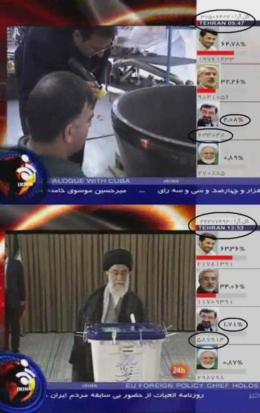 Wikipedia has an image which is thought provoking but will alas be removed after June 15th for some reason or other. Perhaps it will last longer here. Fair use and licensing blaa blaa. http://en.wikipedia.org/wiki/Iranian_presidential_elect...sults
