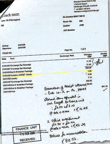 In which case we would presume the folk who run Sheraton hold UNICEF in high esteem & we ought not presume that the busy ceann chomhairle actually read each and every line of the many bills he added to his expense account.