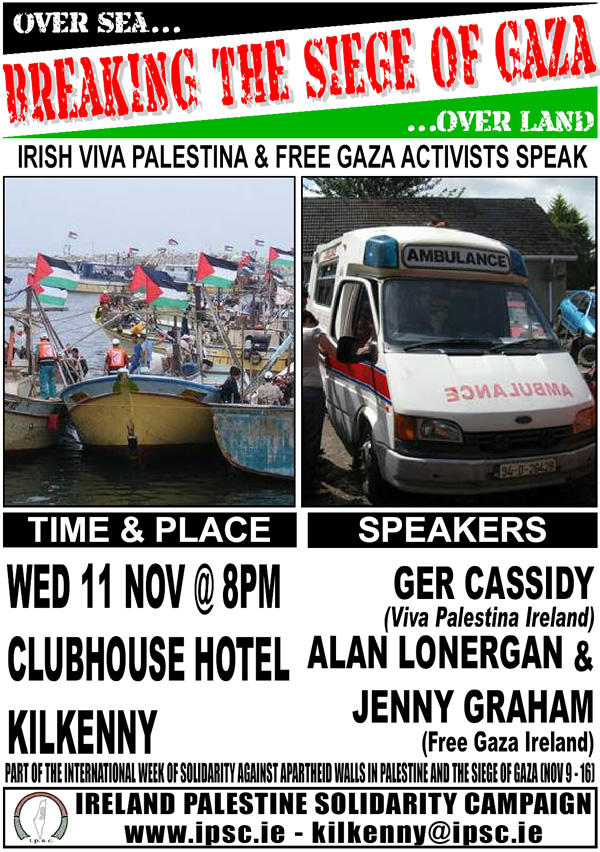 As part of the IPSC's Week of Solidarity Against Apartheid Walls in Palestine and Against the Siege of Gaza, the Kilkenny branch of the IPSC are proud to host a public meeting with Irish activists from the Irish sections of Viva Palestina and the Free Gaza Movement. VP and the FGM will be taking part in the international siege breaking convergence on Gaza that will coincide with the anniversary of Israel’s 2008/09 winter attack on the besieged coastal strip