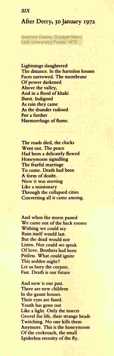 The poem was written in 1972 on the day of the funerals of the Bloody Sunday victims. Heaney released half the poem in 1997 on the 25th anniversary of the massacres and, perhaps more significantly, three years after the IRA ceasefire. I wonder what is in the other half. Perhaps now, after the Saville Report has been released, Heaney might consider releasing the remainder for posterity.